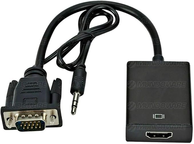 Adaptador conversor de sinal VGA para HDMI com suporte a áudio. Ideal para conectar computadores antigos com saída VGA a monitores, TVs ou projetores com entrada HDMI. Inclui entrada de áudio P2 e cabo USB para alimentação.