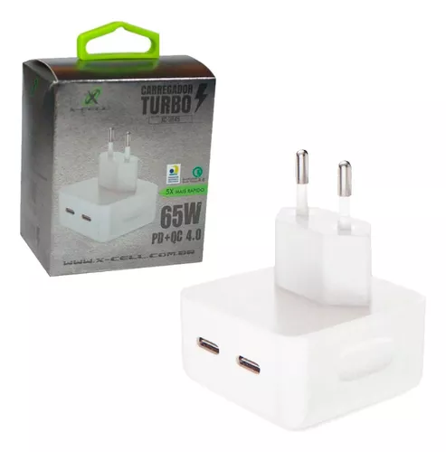 Fonte de carregamento bivolt da Multilaser com 2 portas USB-C, ideal para carregar simultaneamente dois dispositivos compatíveis, como celulares, tablets e acessórios.