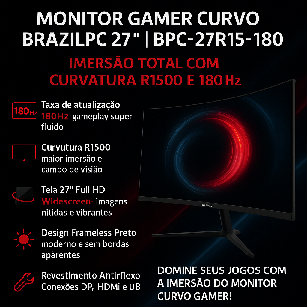 Seja o primeiro a avaliar “MONITOR LED 27 BRAZILPC GAMER BPC-27R15-180 FHD CURVO R1500 180Hz FRAMELESS PRETO WIDESCREEN BOX IF (CURVATURA R1500/A”